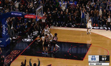 在库里、吉米·巴特勒宣告缺阵、德雷蒙德·格林第二节崴脚离场的情况下,勇士在末节一度抹平了76人24分的领先优势。关键时刻,76人新秀V.J.埃奇库姆在马克西跳投不中后完成空接补篮,只给勇士留下0.9秒。