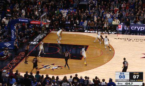 76人99比98反超,勇士没有暂停,所有人都以为比赛就此结束。然而,勇士后卫希尔德立刻捡起篮球,像扔橄榄球一样,将球全场长传给冲刺的梅尔顿,后者看似获得了一次不可思议的绝杀机会。